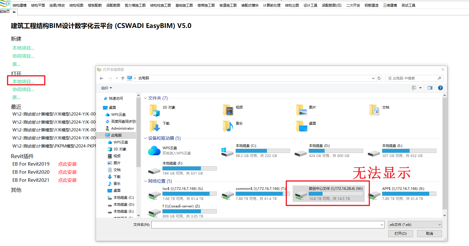在EB中【打开项目】、【新建项目】或其他需要打开文件管理器操作时,无法在EB中找到服务器位置